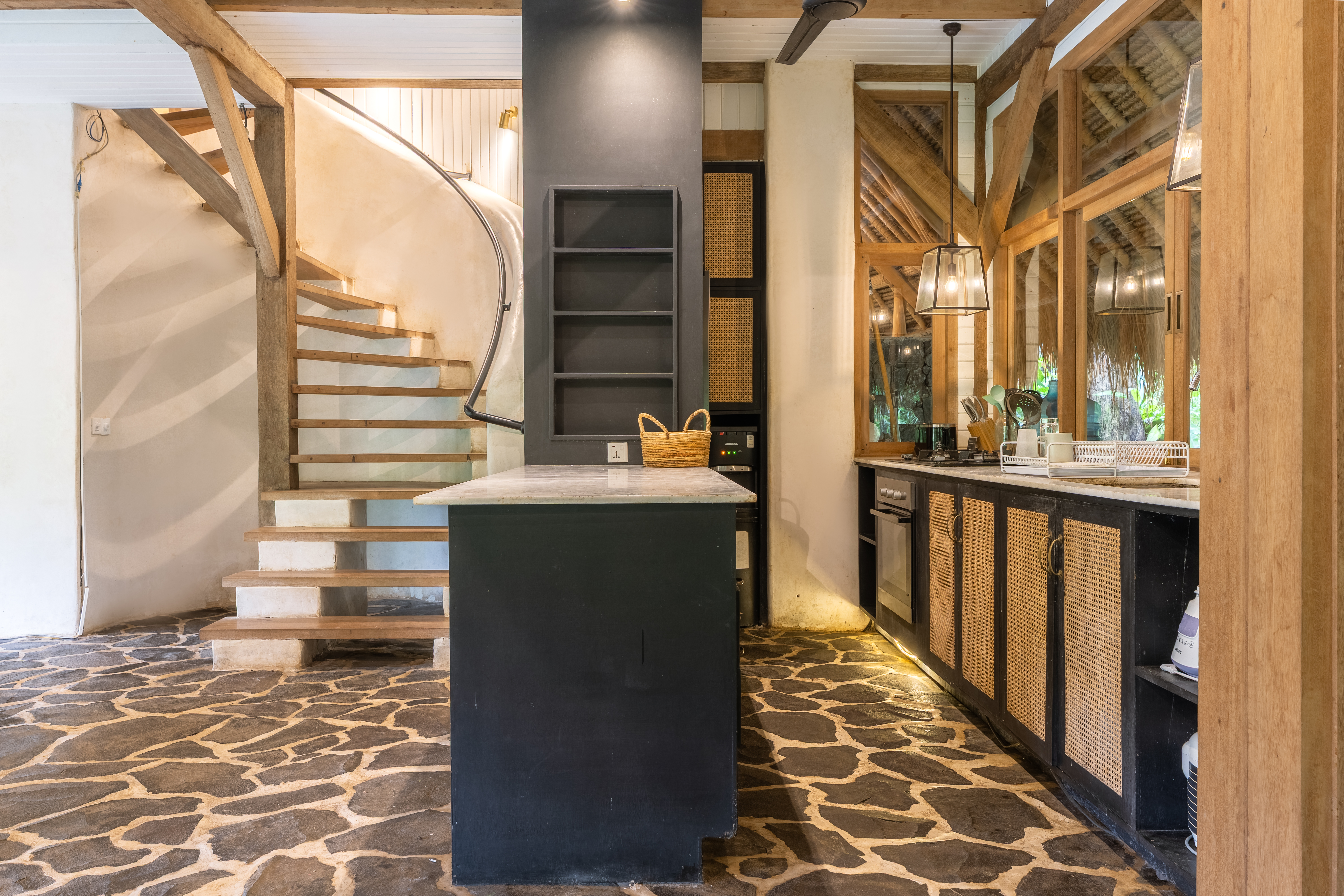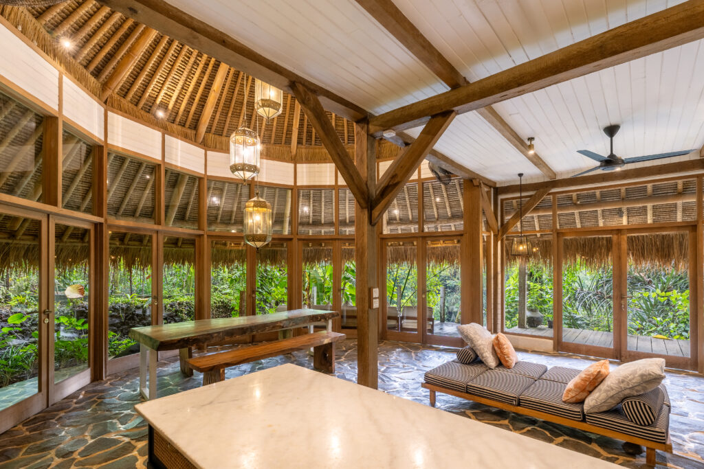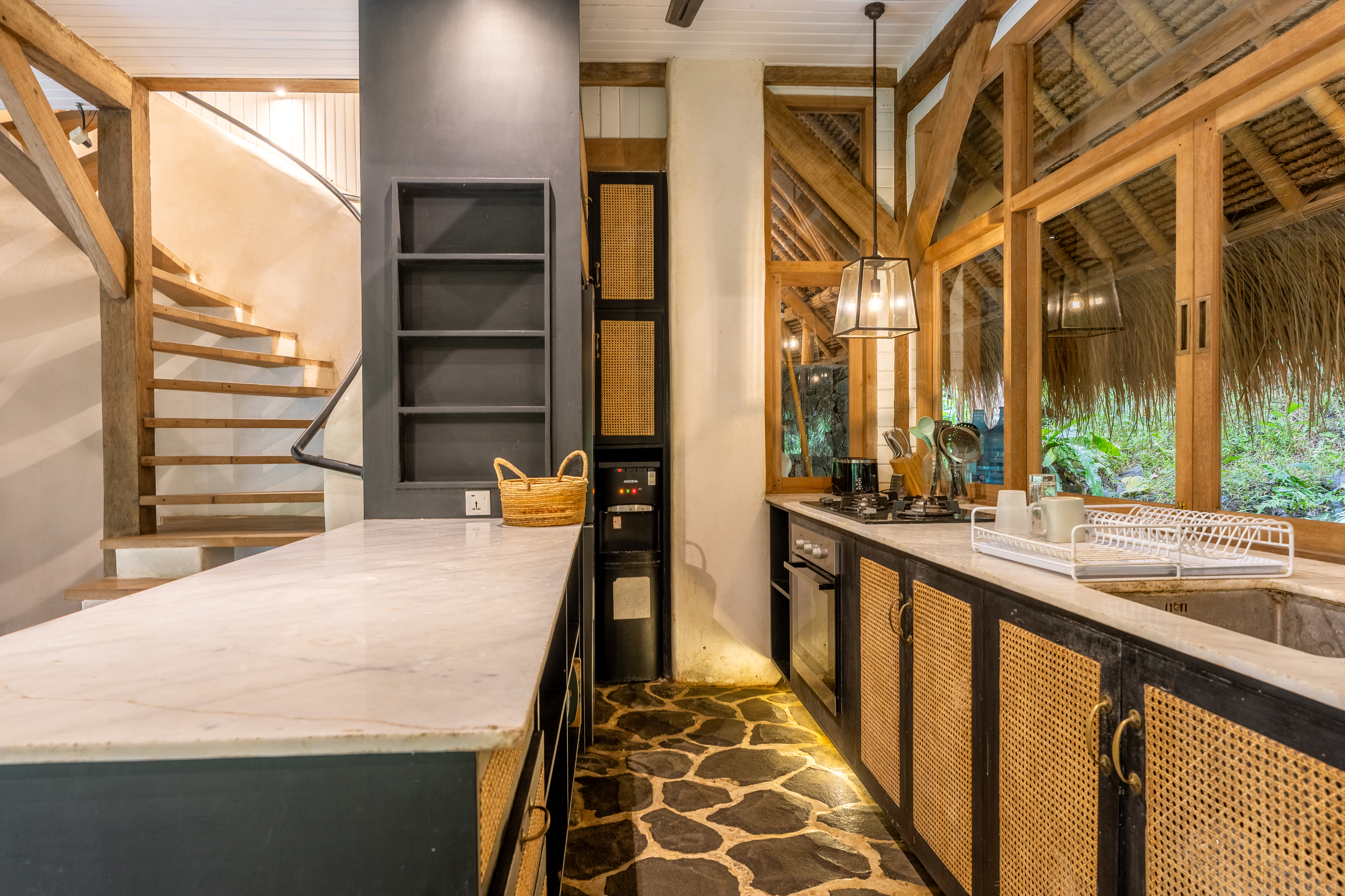 Expansive living and dining area with a fully equipped kitchen. Additional alfresco wooden dining space for memorable meals with family and friends. Beautiful Balinese interiors, enhanced by modern comforts